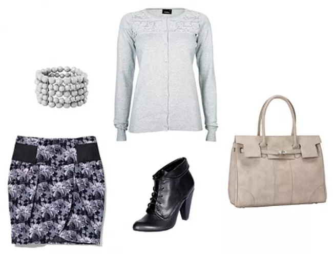 kardigan Cubus, spódnica House, bransoletka Cubus, botki Stradivarius, torebka F&F