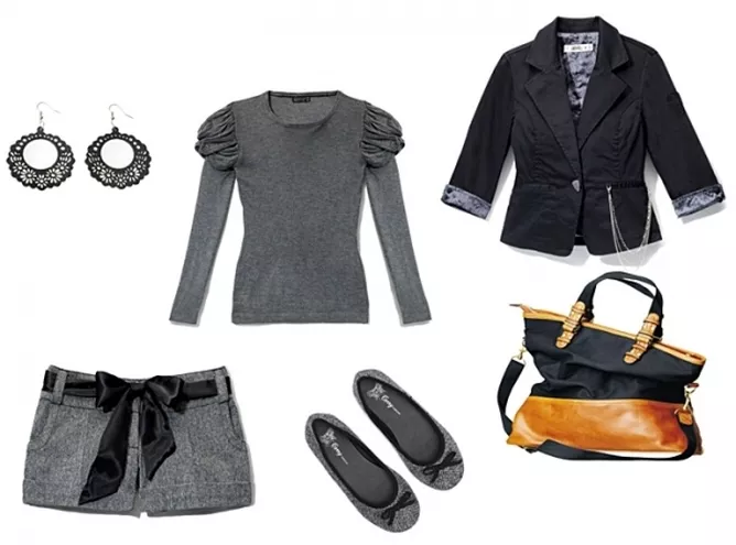 szorty Reserved, bluzka Mohito 89,90 zł, żakiet Reserved, kolczyki Stereo 14,99 zł, baleriny Carry 69,99 zł, torebka H&M