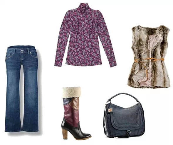 dżinsy Orsay 129,90 zł, botki Pull&Bear, kożuch BGN, apaszka H&M 39,90 zł, golf Stradivarius, torebka Stradivarius