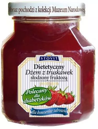 Fruktoza to całkowicie naturalny i zdrowy środek słodzący, który ma bardzo korzystny wpływ na cały nasz organizm. Stabilizuje poziom cukru we krwi, korzystnie wpływając na nasze samopoczucie i ograniczenie łaknienia. Badania wykazują, że fruktoza wzmacnia mięsień sercowy, zmniejsza ryzyko wystąpienia próchnicy. Fruktoza jest niskokaloryczna, zapobiega otyłości i związanych z nią chorobom: cukrzycy, nadciśnieniu, miażdżycy.Nowe dżemy Stovit Premium słodzone fruktozą to prawdziwa owocowa rozkosz dla podniebienia. Doskonała, unikalna receptura, szlachetny smak najlepszych owoców i korzystna dla zdrowia fruktoza sprawiają, że możesz delektować się nimi każdego dnia bez żadnych ograniczeń.Zdrowe, pozbawione cukru, konserwantów i sztucznych barwników, o wysokiej zawartości dojrzałych w słońcu owoców to wyjątkowa propozycja dla wszystkich smakoszy!Dietetyczny dżem z truskawek słodzony fruktoząSporządzony z 45g owoców na 100g produktu.Wartość odżywcza 100g dżemu: wartość energetyczna122 kcal (511kJ); białko 0,3g; węglowodany 30g;tłuszcz 0,2g.Producent: STOVIT Poj. 230gSugerowana cena detaliczna ok. 4,0 PLNDietetyczny dżem z moreli słodzony fruktoząSporządzony z 50g owoców na 100g produktu.Wartość odżywcza 100g dżemu: wartość energetyczna121 kcal (505kJ); białko 0,4g; węglowodany 30g;tłuszcz 0,1g.Producent: STOVIT Poj. 230gSugerowana cena detaliczna ok. 4,0 PLNWyjątkowe arcydzieła sztuki znajdziesz na ich niepowtarzalnych zakrętkach!Aż 38 obrazów polskich mistrzów pędzla pochodzących ze zbiorów Muzeum Narodowego w Poznaniu! To prawdzie gratka dla koneserów sztuki!Rozkoszuj się cudownym smakiem dżemów STOVIT PREMIUM i zbierzkolekcję polskiego malarstwa.