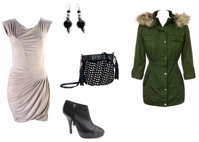 sukienka Szafomania 149 zł, torebka Orsay 69,90 zł, kolczyki H&M 24,90 zł, botki Kazar, kurtka Stradivarius