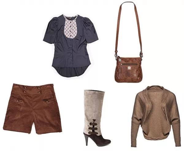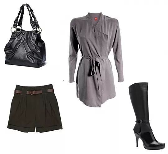 szorty Bialcon 125 zł, bluzka Bialcon 139 zł, kozaki Venezia, sweter New Yorker 69,95 zł, torebka Tous 950 zł