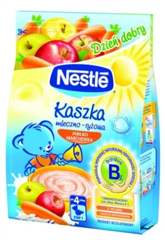 Kaszka mleczno-ryżowa jabłko-marchewka po 4. miesiącu życia szczególnie polecana jest dla najmłodszych dzieci, ponieważ jabłko oraz marchewka to zazwyczaj pierwsze składniki, które wprowadzane są do diety malucha.