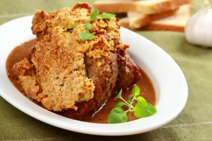 Karkówka z musztardową chrupką skórką w majerankowym sosie