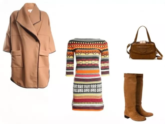 sukienka Solar 339 zł, kozaki Via Roma 449 zł, torebka Zara 169 zł, ponczo H&M 499 zł