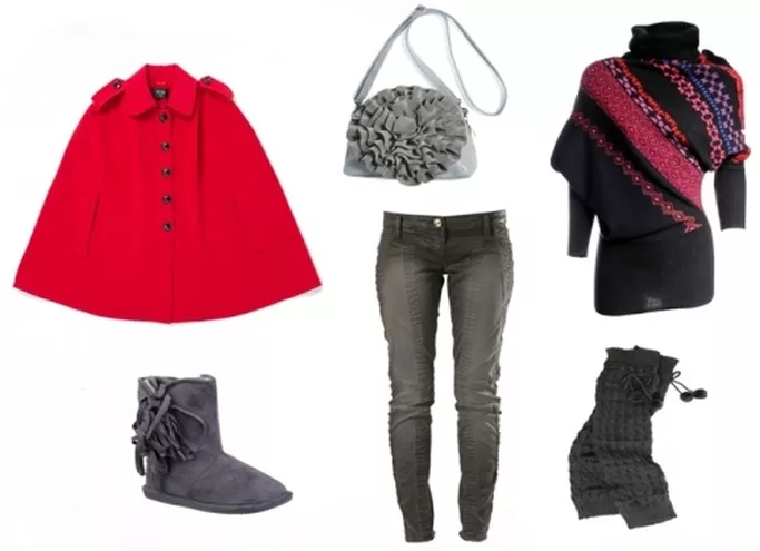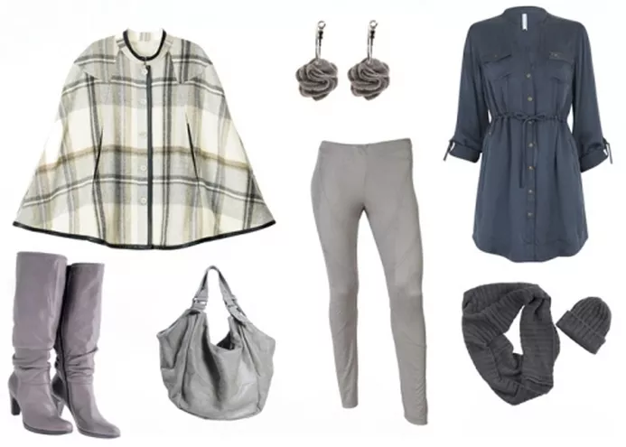 ponczo Solar 569 zł, botki Marks&Spencer, torebka Gino Rossi 699 zł, bransoletka Solar 39 zł, szal Solar 199 zł, sukienka Solar 279 zł