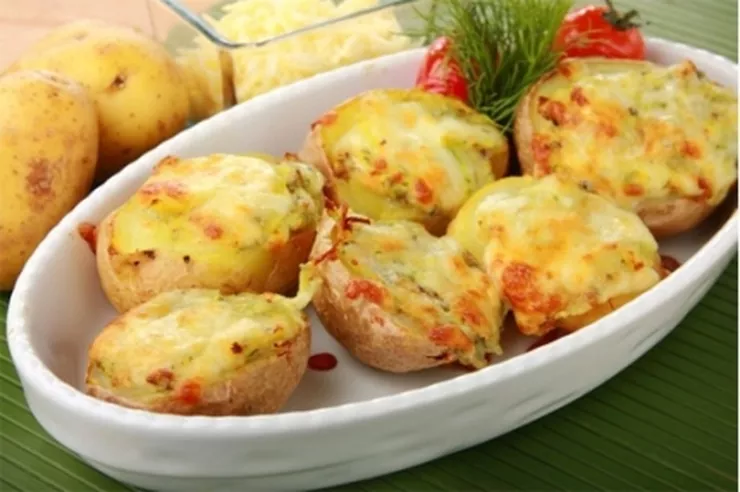 4. Nafaszeruj ziemniaki przygotowaną masą, a ich wierzch posyp resztą sera i piecz 15 minut piekarniku rozgrzanym do 180°C.