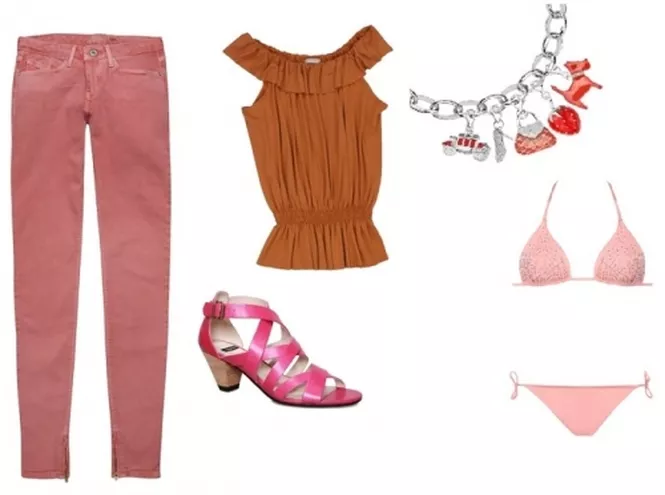 Impreza wakacyjna na plaży? Tylko w kolorze! Bluzka z fantazyjną falbaną i koralowe spodnie rurki to najgorętsze połączenie sezonu! Sandałki i strój kąpielowy w rożnych odcieniach rożu idealnie uzupełniają się i sprawiają, ze cały strój chce się "zjeść".