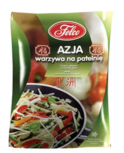 Warzywa na patelnię „Azja” z grillowanymi krewetkamiPrzepis dla 4 osóbSkładniki: mieszanka warzywna „Azja” Felco - 900g (2 paczki) krewetki obrane z ogonkami - 240gdressing ziołowy lub sos vinaigrette oliwa z oliwek - 20g świeże zioła do dekoracji (np. szczypiorek, kolendra)Sposób przygotowania:Krewetki zabejcować w soku z cytryny i przyprawie do ryb na 30 minut. Następnie nadziać na patyczki do szaszłyków i ugrillować. Mieszankę warzywną podsmażyć na oliwie z oliwek. Na talerzu ułożyć warzywa wraz z krewetkami i udekorować świeżymi ziołami.Sugerowana cena i dostępność sprzedaży:Mieszanka warzywna „Azja” (opakowanie 450g) kosztuje ok. 3,5 zł/szt.Produkt dostępny jest w sklepach detalicznych, supermarketach oraz hipermarketach na terenie całego kraju.