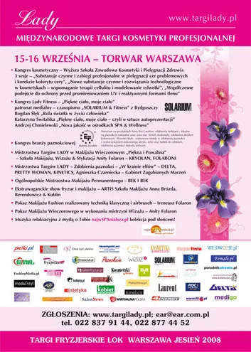 10% zniżki do końca czerwca – nie przegap!Dla wszystkich zainteresowanych przygotowaliśmy także bardzo atrakcyjną ofertę cenową oraz bardzo bogaty program imprez podczas trwania targów. Powierzchnia zabudowana za 1 m2. 420 PLN Powierzchnia niezabudowana za 1 m2. 350 PLN Zgłoszenia na targi już są dostępne na stronie www.targilady.pl oraz w załączniku.KONGRESYPodczas targów odbędą się trzy najwyższej klasy kongresy prowadzone i firmowane przez światowej sławy autorytety – KOSMETYCZNY, Branży PAZNOKCIOWEJ, SOLARYJNYKOSMETYCZNYDwudniowy kongres kosmetyczny poprowadzi renomowana i znana na całym świecie Wyższa Szkoła Zawodowa Kosmetyki i Pielęgnacji Zdrowia, która na pewno zainteresuje bogatym programem zarówno kosmetyczki, fryzjerki jak i uczennice szkół fryzjersko- kosmetycznych, wizażu i stylizacji. Przedstawione zostaną trzy sesje tematyczne wykładów. Sesja 1 to „Substancje czynne i zabiegi profesjonalne w pielęgnacji cer problemowych i korekcie kolorytu cery”, sesja 2 „Nowe substancje czynne i rozwiązania technologiczne w kosmetykach – wspomaganie terapii cellulitu i modelowanie sylwetki” oraz „Współczesne podejście do ochrony przed promieniowaniem UV i reaktywnymi formami tlenu” w sesji 3. Wszyscy uczestnicy Kongresu otrzymują dyplom. Wstęp na kongres 10 PLNWięcej informacji na temat kongresu tel. kosmeto@wszkipz.pl, tel. 22 635 50 09PAZNOKCIOWYRedakcja czasopisma AKADEMIA PAZNOKCIA ORAZ FIRMA EUROFASHION pragnie zaprosić Państwa do udziału w jednodniowym Profesjonalnym Kongresie, który odbędzie się 15 września Na to wyjątkowe wydarzenie zapraszamy wszystkie stylistki paznokci i kosmetyczki z całej Polski.Gościem specjalnym Kongresu będzie Emilia Jasińska – Quell, Dyplomowany Instruktor AP, Mistrzyni EuropyCelem Kongresu jest zaprezentowanie najnowszych produktów, międzynarodowych trendów, oraz technik stylizacji paznokci.Tematyka Kongresu EUROFASION AKADEMIA PAZNOKCIA10–10.45: Manicure na produktach firmy Bio Creative – prowadzi Monika Trzcińska i Anna Watkowska, Instruktor AP10.50-11.35: Zdobienia farbkami - idealne na paznokcie naturalne oraz sztuczne – prowadzi Marzena Stala, Dyplomowany Instruktor AP11.40-12.25: French doskonały – prowadzi Aneta Janeczek, Dyplomowany Instruktor AP, Mistrzyni Polski Profesjonalistów Nail Design 200612.30-13.15: Zdobienia akrylem kolorowym - prowadzi Emilia Jasińska – Quell, Dyplomowany Instruktor AP, Mistrzyni Europy13.20-14.05: Russian Style – najnowsze trendy w zdobieniu paznokci z wykorzystaniem kolorowego akrylu, żelu oraz farbek do zdobień – prowadzi Ewa Kargetta, Dyplomowany Instruktor AP, II Vice Mistrzyni Polski Nail Art Poland 14.10-15.00: Zdobienia paznokci metodą airbrush – prowadzi Sylwia Tomaszowska, Dyplomowany Instruktor AP Wszyscy uczestnicy Kongresu otrzymają dyplom. Wstęp na kongres 10 PLNWięcej informacji na temat kongresu tel. 058 692 22 26, ciechacka@akademiapaznokcia.pl; www.eaurofashion.com.plSOLARYJNYCzasopismo SOLARIUM & Fitness z Bydgoszczy poprowadzi w niedzielę 16 września, urozmaicony i bardzo ważny, przede wszystkim dla gabinetów solaryjnych i kosmetycznych, Kongres Lady Fitness, pod tytułem „Piękne ciało, moje ciało”. Na kongres zapraszamy od godz. 12-14. Będzie można Wysłuchać wykładów Bogdana Ślęka „Rola światła w życiu człowieka”, Katarzyny Świtalskiej (Trenera i konsultanta zarządzania) „Piękne ciało, moje ciało – czyli o sztuce autoprezentacji” oraz Andrzeja Chmielewskiego „Nowa jakość w ośrodkach SPA & Wellness”. Wszyscy uczestnicy Kongresu otrzymują dyplom. Wstęp na kongres BEZPŁATNYWięcej informacji na temat kongresu tel. SOLARIUM & Fitness" z BydgoszczyDariusz Idkowiak, tel. 0-603-695-454, e-mail: redakcja@solarium.net.pl, www.solarium.net.plMISTRZOSTWAOdbędą się także Mistrzostwa, których nie mogło zabraknąć na naszych targach.Do zdobycia w Mistrzostwach oprócz tytułu Mistrzowskiego także bardzo cenne nagrody rzeczowe. Zgłoszenia na wszystkie Mistrzostwa dostępne na stronie www.targilady.pl – z lewej strony w zakładce zwiedzający.MISTRZOSTWA MAKIJAŻU WIECZOROWEGOMistrzostwa Targów Lady w Makijażu Wieczorowym 2007 „Piękna i Powabna” poprowadzi Szkoła Makijażu Profesjonalnego Wizażu & Stylizacji Anity Folaron; - nagrody KRYOLAN, FOLARONII Miejsce – Dyplom za zajęcie I miejsca w Mistrzostwach Targów „Lady” Makijaż Wieczorowy „Piękna i Powabna” oraz wybrany rodzaj kursu wizażu lub stylizacji o wartości 2.000 zł. (Słownie dwa tysiące złotych) w Szkole Makijażu, Wizażu i Stylizacji Anity Folaron oraz nagrody rzeczowe – przybory i kosmetyki profesjonalne KRYOLAN - „KRYOLAN CITY ” WARSZAWA o wartości 800zł. oraz od firmy „FOLARONI” POZNAŃ o wartości 650zł.II Miejsce – Dyplom za zajęcie II miejsca w Mistrzostwach Targów „Lady” Makijaż Wieczorowy „Piękna i Powabna” oraz wybrany rodzaj kursu wizażu lub stylizacji o wartości 1.500 zł. (słownie jeden tysiąc pięćset złotych) w Szkole Makijażu, Wizażu i Stylizacji Anity Folaron oraz nagrody rzeczowe – przybory i kosmetyki profesjonalne KRYOLAN - „KRYOLAN CITY ” WARSZAWA o wartości 800zł. oraz od firmy „FOLARONI” POZNAŃ o wartości 650zł.III Miejsce – Dyplom za zajęcie III miejsca w Mistrzostwach Targów „Lady” Makijaż Wieczorowy „Piękna i Powabna” oraz wybrany rodzaj kursu wizażu lub stylizacji o wartości 1.000 zł. (Sownie jeden tysiące złotych) w Szkole Makijażu, Wizażu i Stylizacji Anity Folaron oraz nagrody rzeczowe „FOLARONI” o wartości 500,00MISTZROSTWA ZDOBIENIA PAZNOKCIMazowieckie Mistrzostwa Zdobienia Paznokci „W krainie Elfów” poprowadzi Gabinet Zagubionych Marzeń Agnieszki Czarnieckiej oraz firma Delta, która znana jest szczególnie pod nazwami marek oferowanych produktów Pretty Woman Kinetics; I Miejsce - tytuł Mistrza Targów LADY w zdobieniu paznokci oraz nagrody rzeczowe. W