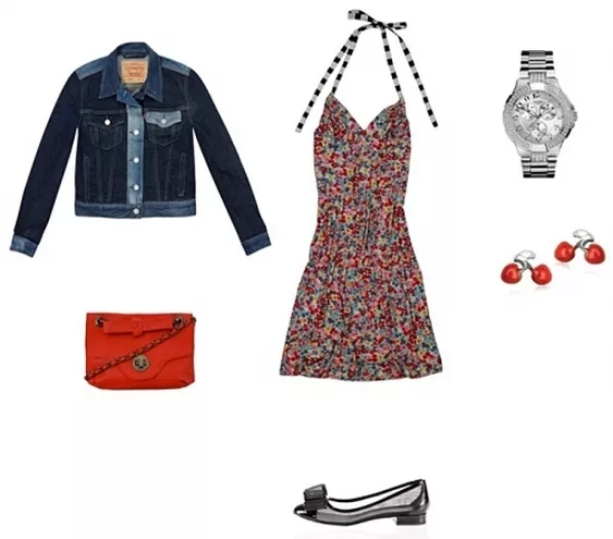 Na wieczorne wyjście na kolację lub romantyczny spacer ubierz sukienkę w wiosenne kwiaty. Koniecznie załóż do niej modną dżinsową kurtkę i kobiece balerinki. Doskonałym dodatkiem, który przełamie stylizację będzie męski zegarek oraz zabawne kolczyki w kształcie wisienek. Mała czerwona torebka świetnie sprawdzi się jako akcent kolorystyczny.