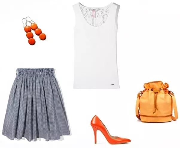 top Reserved, kolczyki Pakamera.pl 42 zł, spódnica Reserved 99,99 zł, torebka Zara 129 zł, czółenka Zara 149 zł