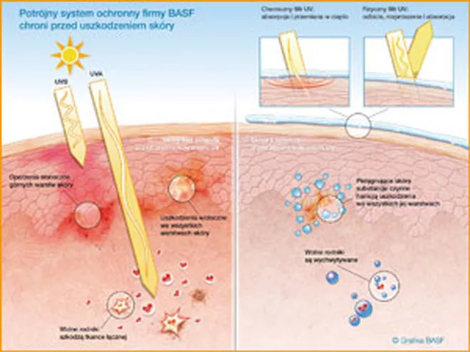 Za nieszkodliwe uważano natomiast promieniowanie UVA, stanowiące 90% docierającego do ziemi światła ultrafioletowego. W międzyczasie stało się jednak jasne, że także i ono szkodzi skórze. Powoduje bowiem między innymi przedwczesne starzenie się skóry, czyli tzw. fotoaging. Symptomem są tworzące się zmarszczki, mała elastyczność skóry, przebarwienia pigmentowe i zmniejszenie reakcji obrony immunologicznej organizmu. Ponieważ organizm nie ostrzega przed zbyt dużym promieniowaniem UVA, jak ma to miejsce w przypadku promieniowania UVB w postaci oparzeń słonecznych, efekty ekspozycji na promieniowanie UVA sumują się i stają się widoczne dopiero po latach.Kremy słoneczne chronią jak dotychczas niemal tylko przed promieniowaniem UVB, a tym samym przed oparzeniami słonecznymi. Zbyt mała jest natomiast ochrona przed promieniowaniem UVA. Problem ten zauważyła Komisja UE, wydając w zeszłym roku zalecenie, którego celem ma być ustalenie minimalnego progu ochrony przed promieniowaniem UVA w artykułach przeznaczonych do ochrony przed słońcem. Na promieniowanie UVA jesteśmy jednak narażeni nawet wtedy, gdy słońce przykryte jest chmurami, przebywając w półcieniu i za oknami. „Filtry UV są coraz częściej stosowane w codziennej pielęgnacji ciała i kosmetyce dekoracyjnej. Należy przy tym szczególną uwagę zwrócić na niezawodną ochronę przed wolnymi rodnikami oraz przedwczesnym starzeniem się. Zarówno wolne rodniki, jak i przedwczesne starzenie się są głównie efektem głęboko przenikającego promieniowania UVA”, mówi dr Heike Flößer-Müller, ekspert ds. ochrony przed słońcem w Technical Support Cosmetic Solutions firmy BASF. „W tym celu koncern BASF opracował niezawodny filtr UVA Uvinul® A Plus.“Promienie UVA powodują w tkance łącznej przede wszystkim chroniczne uszkodzenia. Wytwarzają wolne rodniki, a więc wysoko reaktywne, agresywne związki, które atakują wszystko w ich bezpośrednim otoczeniu. Szkodzą one na przykład błonom komórkowym i atakują materiał genetyczny. Wskutek tego dochodzi do zaburzeń delikatnej równowagi funkcji komórkowych. Promienie UVA powodują także nadmierną stymulację realizowanego przez organizm rozpadu włókien tkanki łącznej, składającej się z elastyny i kolagenu. Skóra traci przez to elastyczność i wilgotność. Tworzą się zmarszczki, które z czasem pogłębiają się. Przed tymi objawami chroni innowacyjny filtr UVA Uvinul® A Plus. Absorbuje on emitowane promieniowanie i zamienia je na nieszkodliwe ciepło. Jest bardzo odporny na światło, dzięki czemu zapewnia długotrwałą ochronę.Profesor dr Leonhard Zastrow, kierownik komórki badawczej producenta kosmetyków Lancaster w Monako, dokładnie przetestował filtr: „Uvinul® A Plus potrafi efektywnie przechwytywać promieniowanie UVA, znacznie redukując powstawanie wolnych rodników w skórze. Ponadto można go znakomicie łączyć z innymi składnikami kosmetycznymi. Dla nas jako producenta kosmetyków jest to wielką zaletą.” Do obszernej koncepcji ochrony przed promieniowaniem UV firmy BASF należą nie tylko chemiczne filtry UV, jak Uvinul® A Plus, lecz również filtry fizyczne. Niczym małe lusterka odbijają one światło – i to zarówno długofalowe promieniowanie UVA, jak i krótkofalowe promieniowanie UVB. Rolę minilusterek spełniają drobniutkie cząstki dwutlenku tytanu i tlenku cynku. Mają one wielkość najwyżej jednej pięciotysięcznej milimetra i dlatego są na skórze niewidoczne. Trzeba by ułożyć obok siebie około 400 takich cząsteczek, aby osiągnęły one grubość ludzkiego włosa. Pomimo swej małej wielkości, cząsteczki te – zawarte w preparatach do ochrony przed słońcem – nie są wchłaniane przez zdrową skórę. Pokazują to zarówno badania przeprowadzone przez BASF, jak i niezależne analizy zrealizowane w ramach projektu Unii Europejskiej Nanoderm.Niezależnie od tego, czy chemiczne czy fizyczne, nawet najlepsze filtry z najwyższym faktorem ochrony przed słońcem nie są w stanie zapobiec wnikaniu pewnej dawki promieniowania UV do skóry. Produkty firmy BASF chronią, bowiem zawarte w nich wysokoaktywne przeciwutleniacze, jak specjalne formy witaminy C i E, unieszkodliwiają wolne rodniki i chronią komórki skóry przed uszkodzeniami, jakie niesie z sobą proces utleniania. Substancje czynne z rumianku i prowitamina B5 działają antyzapalnie i równocześnie pielęgnują. Witamina A normalizuje nadmiernie stymulowany przez promieniowanie UVA rozpad włókien tkanki łącznej, następuje rewitalizacja komórek i zmniejszenie głębokości zmarszczek.„Pod postacią filtrów UV, przeciwutleniaczy oraz innych stabilizujących i kojących skórę substancji czynnych, BASF oferuje dobrze dobrany potrójny system ochrony przed promieniowaniem UV i jego skutkami”. mówi dr Heike Flößer-Müller. „W kontakcie ze słońcem powinniśmy postępować bardziej odpowiedzialnie – i to nie tylko w czasie urlopu, lecz także na co dzień.”PerspektywaWskutek zmian klimatycznych promieniowanie UV, jakie dociera do powierzchni ziemi, staje się coraz intensywniejsze. Coraz większa liczba konsumentów dostrzega, jak ważna jest ochrona szczególnie przed promieniowaniem UVA, aby chronić skórę przed przedwczesnym starzeniem i innymi uszkodzeniami spowodowanymi światłem słonecznym. Dążenie do młodego wyglądu i piękna, do tego, aby mieć promienistą i pozbawioną zmarszczek skórę, zaowocowało powstaniem aktualnie jednego z najbardziej lukratywnych rynków na świecie – „przemysłu antiagingowego”. Zgodnie z przeprowadzoną w czerwcu 2006 roku przez przedsiębiorstwo marketingowo-informacyjne ACNielsen analizą, produkty chroniące przed starzeniem się stanowią w chwili obecnej 30 procent całego międzynarodowego rynku kosmetyków do pielęgnacji skóry. W samych tylko Niemczech na kosmetyki do pielęgnacji twarzy, zapobiegających przedwczes