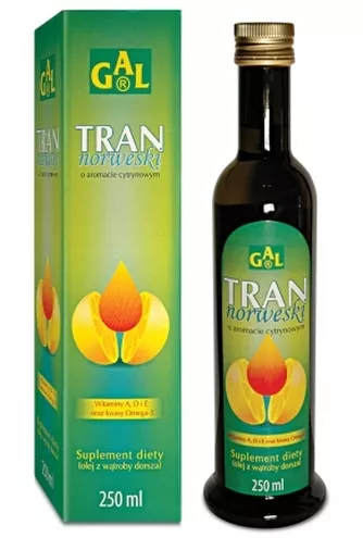 TRAN NORWESKI O AROMACIE CYTRYNOWYM W PŁYNIE (suplement diety) firmy GAL jest dostępny w aptekach. Cena det. (250 ml) – ok.20 zł
