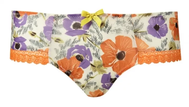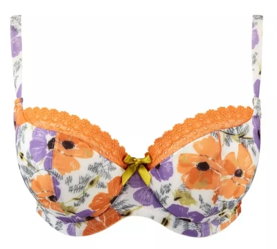Utrzymana w wibrujących kolorach zieleni, fioletów i pomarańczy Poppy przeniesie nas do stylu retro. Dopełnienie całości zapewnią satynowe oliwkowe kokardki oraz barwne wykończenia usztywnianych miseczek dostępnych do rozmiaru H.