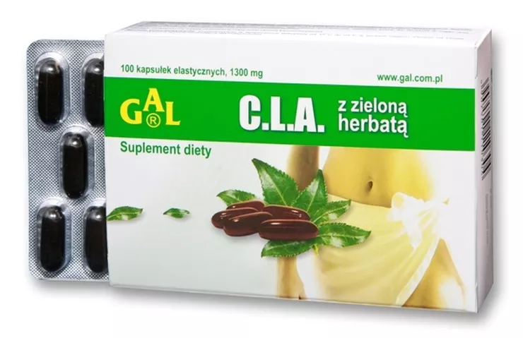 C.L.A. z zieloną herbatą firmy GAL to nowy suplement diety. Stanowi bogate źródło sprzężonego kwasu linolowego C.L.A., pochodzących z zielonej herbaty polifenoli oraz kwasów tłuszczowych z rodziny Omega-3. Ekstrakt z zielonej herbaty i kwas linolowy C.L.A. to idealne połączenie składników ułatwiających odchudzanie. Kwas linolowy C.L.A. przyspiesza bowiem tempo metabolizmu tłuszczowego. Wpływa również na aktywność głównych związków enzymatycznych, odpowiadających za magazynowanie tłuszczu w komórkach, powodując osłabienie ich aktywności. Z kolei koncentracja polifenoli zawartych w zielonej herbacie pomaga poprawiać termogenezę, a tym samym tempo w jakim ciało spala kalorie. Podniesiony w ten sposób metabolizm pomaga w utracie zbędnych kilogramów.