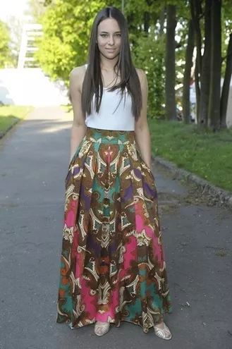 Wzorzysta tkanina łącząca odcienie szmaragdu, brązu i fuksji jest kluczowym motywem jesienno-zimowej kolekcji Natalii Jaroszewskiej. Przypadła do gustu również współpracującej na stałe z projektantką Annie Czartoryskiej. Aktorka wybrała supermodną spódnicę maxi, której objętość powstała z czterech metrów zjawiskowej tkaniny. Ania nadała stylizacji współczesny, nonszalancki sznyt łącząc ją z białym tank-topem.