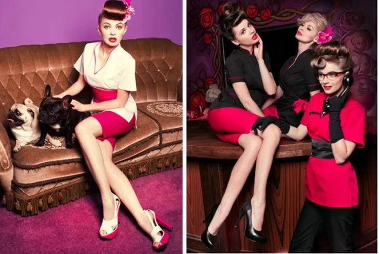 Sesja w klimacie retro ma być dowodem na to, że pięknie oraz elegancko można prezentować się także w pracy, nawet w uniformie, który wcale nie musi być nudny i nieładny. Zaprezentowane na zdjęciach ciuchy kuszą żywymi kolorami, dopasowanym krojem, prawie jak letnie sukienki z popularnych sklepów z odzieżą codzienną.