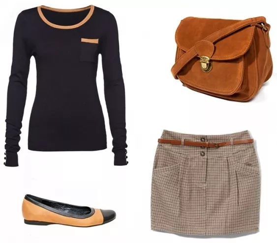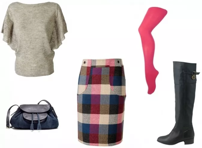 sweter Camaieu 139 zł, spódnica Solar 229 zł, rajstopy Gatta, kozaki River Island, torebka Zara 399 zł