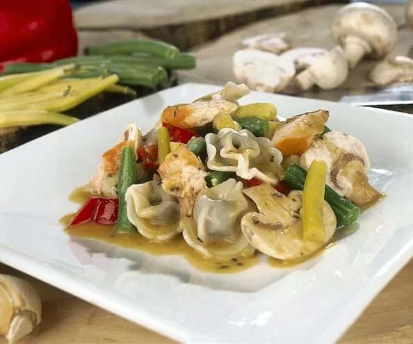 Sałatka z uszkami z pieczarkami, wędzonym łososiem i kolorową fasolką szparagową