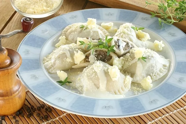 Pierogi staropolskie z sosem z bryndzy z parmezanem i szałwią