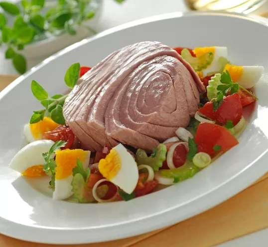 Tuńczyk z, marynowanymi w ziołach, pomidorami i gotowanym jajkiem