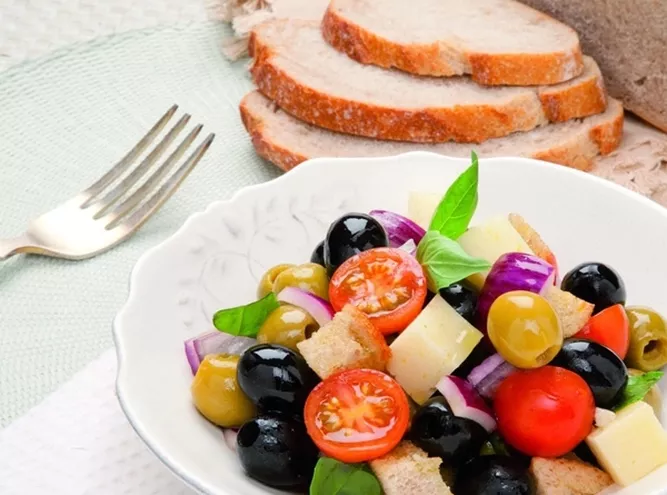 Posiekaj czerwoną cebulę, pokrój chleb i ser w kostkę, a pomidorki przekrój na pół. Powyższe składniki włóż do miseczki. Dodaj zielone i czarne oliwki oraz świeże liście bazylii. Całość polej kilkoma kroplami oliwy z oliwek. Wszystkie składniki wymieszaj i pozostaw na 10 minut.