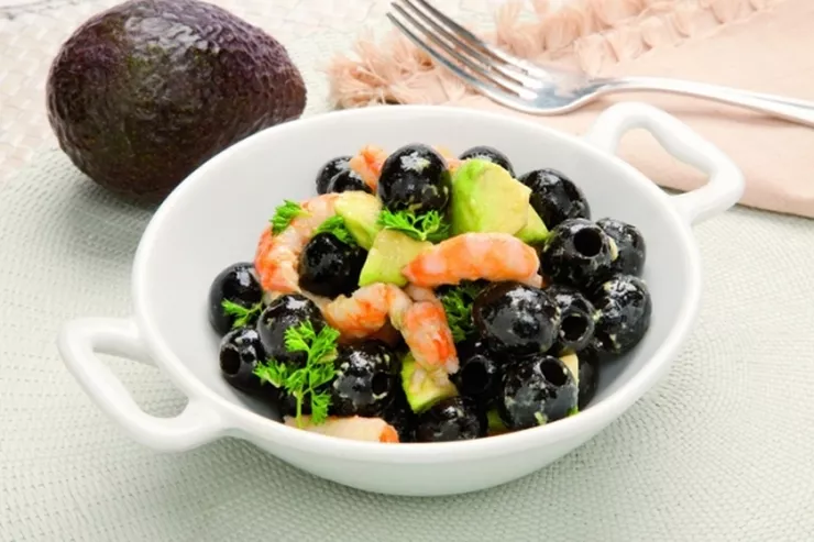 Hiszpańskie czarne oliwki z krewetkami i awokado