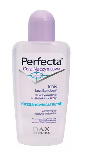 TONIK bezalkoholowy do oczyszczania i odświeżania skóryPERFECTA Cera NaczynkowaCena detal.: ok. 13,40 zł (poj. 175ml)Łagodny tonik do oczyszczania i odświeżania cery polecany szczególnie do skóry z rozszerzonymi i pękającymi naczynkami. Zawiera bogaty w rutynę wyciąg z kasztanowca białego, który wzmacnia i uszczelnia ściany naczyń krwionośnych, zapobiega ich uszkodzeniom oraz zmniejsza widoczność istniejących pajączków. Dodatkowo D-pantenol łagodzi podrażnienia i zaczerwieniania skóry, a mikrofluid nawilżający zapewnia cerze długotrwałą świeżość i zdrowy koloryt.Sposób użycia: Nasączyć wacik i delikatnie rozprowadzić tonik na umytej skórze twarzy, szyi i dekoltu. Powtarzać czynność zmieniając waciki aż do momentu, kiedy nie będzie na nich śladu zanieczyszczeń.