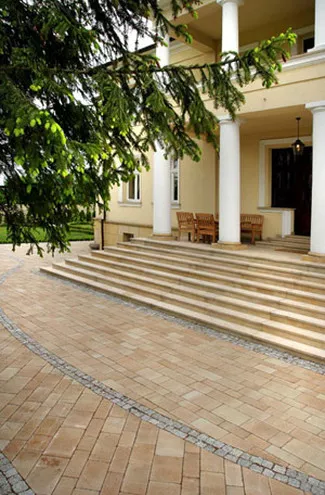 Zgodnie z zasadami architektury krajobrazu nawierzchnia powinna być dopasowana stylem i kolorystyką do elewacji dachu lub innego elementu posesji. Wówczas będą one tworzyć harmonijną całość. Projektując nawierzchnię wokół domu i w ogrodzie niektórzy z nas wybiorą subtelne i naturalne kolory, niosące spokój oraz wyciszenie, inni zaś stworzą bogate i pełne dynamiki zestawienia kolorystyczne. Jednak zarówno przepych nie musi być utożsamiany z kiczowatym bogactwem, jak i minimalizm niekoniecznie oznacza monotonię czy ascetyzm. Każda, umiejętnie zaaranżowana nawierzchnia, dobrze wkomponowana w otoczenie ucieszy nawet najbardziej krytyczne oko. Oto kilka propozycji i rad, w jaki sposób odpowiednio ze sztuką i indywidualnymi gustami zaaranżować przestrzeń wokół domu.Ogród niebanalny - finezja i barwny przepych Kompozycje bogate w różne wzory doskonale sprawdzą się na dużej powierzchni. Nawierzchnia obfita w linie, duże wzory oraz liczne łuki czy okręgi, doda takiemu otoczeniu dynamiki. W dużym ogrodzie doskonale sprawdzi się połączenie różnych kształtów i rozmiarów kostek, podkreślając format i fakturę nawierzchni. Wrażenie przepychu uzyskamy nie tylko poprzez połączenie wielu elementów o różnych wzorach i kształtach, ale także wyraziste zestawienia kolorystyczne, które pozwolą na stworzenie malowniczych, przykuwających uwagę mozaik. Efekt taki pomogą nam uzyskać alejki ułożone z drobnych kostek Piccola z linii Libet Decco, np. w intensywnych kolorach jesieni i kasztanowym połączonymi z jasnym pastello. Unikatowy melanż kolorystyczny powstający w wyniku mieszania kilku barwników w trakcie ich produkcji sprawia, że nawierzchnia ”mieni się” wieloma kolorami, zwłaszcza podczas jesiennej słoty. Taka wielobarwna dróżka pięknie wzbogaca ogród gdzie dominują odcienie zieleni a kwiatów jest raczej niewiele. Dodaje otoczeniu pozytywnej energii. Nawierzchnię wokół domu ożywią i wspaniale przystroją barwne aranżacje powstałe przez zestawienie różnych kolorów i faktur. Efektownie prezentują się połączenia różnobarwnych kostek Piccola z linii Libet Decco. Bogata kolorystyka tych produktów w grupie Elegante (safiro, solaro, tramonto, bianco carrara, granito i nero) oraz Colormix (pastello, kolory jesieni i kasztanowy) pozwoli nam stworzyć imponujące kompozycje. Dzięki trapezowym kształtom, łatwo ułożymy z nich łuki i okręgi, które nawiązując do odcieni na elewacji budynku, stworzą harmonijną całość zarówno z budynkiem o prostej konstrukcji, jak i z małym dworkiem. Uroku całej aranżacji dodadzą także mocniejsze, czerwone akcenty w postaci elementów wykończeniowych. Warto tu przy okazji zwrócić uwagę na ciekawą alternatywę tradycyjnych obrzeży czy palisad - Kravento, np. w kolorze czerwonym.
