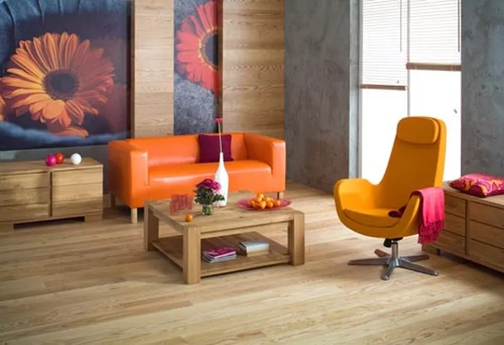 Zakochani w ponadczasowym pięknie naturalnego drewna, z pewnością wybiorą deski szerokie (18 cm) i długie (220cm). Katarzyna Dżus, architekt wnętrz uważa, że sprawdzą się one doskonale w dużych pomieszczeniach. Mając dodyspozycji odpowiedni metraż, możemy spełniać nasze marzenia, np. zastosować nowoczesne, ciemniejsze barwytakich gatunków jak: sucupira, merbau, jatobe czy dąb espresso. Wybór estetyki podłogi rozszerza opcja jejfazowania. Niewidoczne na pierwszy rzut oka subtelne ścięcie (faza) na obu dłuższych brzegach deski, optyczniewydłuża podłogę i dodaje jej lekkości. Światło załamujące się na fazach powoduje, że łączenia desek są bardziejwidoczne, zwłaszcza w przypadku ciemnych gatunków drewna oraz bogato usłojonych. Stosując takie rozwiązaniauzyskamy efekt podłogi wyrazistej i nawiążemy do rustykalnych, tradycyjnych stylów urządzania domów (wiejskichrezydencji). Nie zawsze duże pomieszczenia nas uszczęśliwiają. Są piękne i nowoczesne, ale bywają mało przytulne. Możemy tozmienić stosując ciepłe barwy podłóg, takich jak merbau lub jatobe. W pierwszej przenikają się kolory odżółto-brązowego, przez czerwień aż do ciemnego brązu. W drewnie jatobe „mieszają” się: łososiowy, czerwony ipomarańczowy. Te egzotyczne gatunki są mało wrażliwe na zmiany wilgotności i temperatury. Dlatego, podobnie jakrodzimy dąb i jesion, doskonale sprawdzają się w naszych warunkach klimatycznych, a także na ogrzewaniupodłogowym.