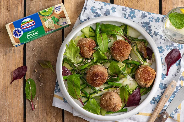 Klopsiki serowe podane na sałatce z grillowanych szparagów i wstążek z cukinii.
