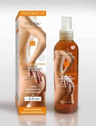 ANTYCELLULITOWY SUPER-KONCENTRAT NA NOC drenująco – wyszczuplający TOŁPA® ma postać lekkiego płynu o barwie mocnej herbaty. Oferowany w formie poręcznego, ułatwiającego aplikację sprayu preparat ma lekką, nietłustą konsystencję, która gwarantuje wysoki komfort użycia. Stanowi doskonałą bazę dla innych zabiegów antycellulitowych. Zalecane jest jego regularne stosowanie codziennie wieczorem przez cały okres trwania kuracji, czyli przez około 6 – 8 tygodni.