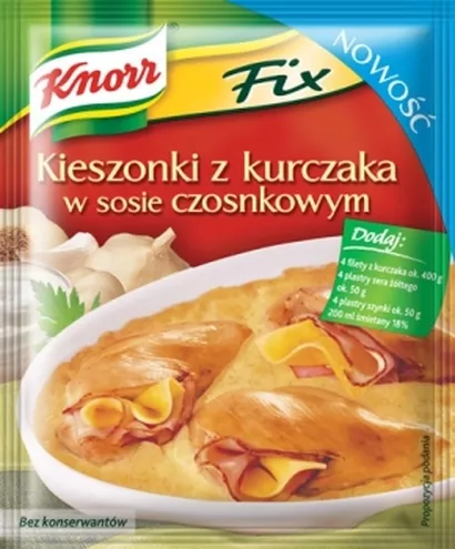 Przygotowanie schabu czy piersi z kurczaka w sposób niebanalny jest proste i szybkie. Jak przystało na prawdziwe Fixy KNORR Kieszonki schabowe z pieczarkami i Kieszonki z kurczaka w sosie czosnkowym na odwrocie opakowań posiadają przepisy, które w prosty sposób pomogą przygotować smaczne danie w 30 minut. Warto jednak pamiętać, że wygląd i ostateczny smak potrawy zależą tak naprawdę od osoby, która ją przygotowuje.