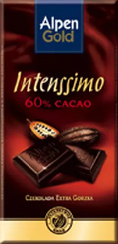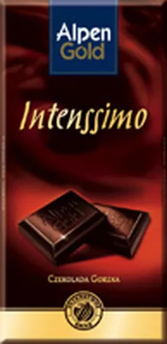 Linia gorzkich czekolad Alpen Gold Intenssimo to intensywność i urozmaicenie doznań smakowych w czterech wariantach: Gorzka, Extra Gorzka 60% Cacao, Gorzka z Kandyzowaną Skórka Pomarańczy i Gorzka z Nadzieniem o Smaku Rumowym. Sugerowana cena detaliczna 100-gramowej tabliczki to 2,89zł.