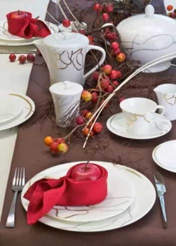 Aby oddać nastrój jesiennego dnia, do aranżowania stołu warto wykorzystać paletę brązowo-czerwonych barw z pomarańczowymi, ożywiającymi całość, akcentami. Biały obrus łączymy bieżnikiem w kolorze ciepłego brązu. Na tym tle pięknie będzie prezentowała się kolekcja Verona marki Villa Italia wykonana z najwyższej jakości białej porcelany. Jesienny charakter kompozycji podkreśli delikatna dekoracja kolekcji Verona w kolorach złota i srebra. Każde nakrycie ozdabiamy jabłkiem otoczonym czerwoną serwetką. Ten piękny kolorowy akcent będzie ożywiał całość stołu. Podobnie jak dekoracja z jarzębiny, która stanowi centralny punkt stylizacji.