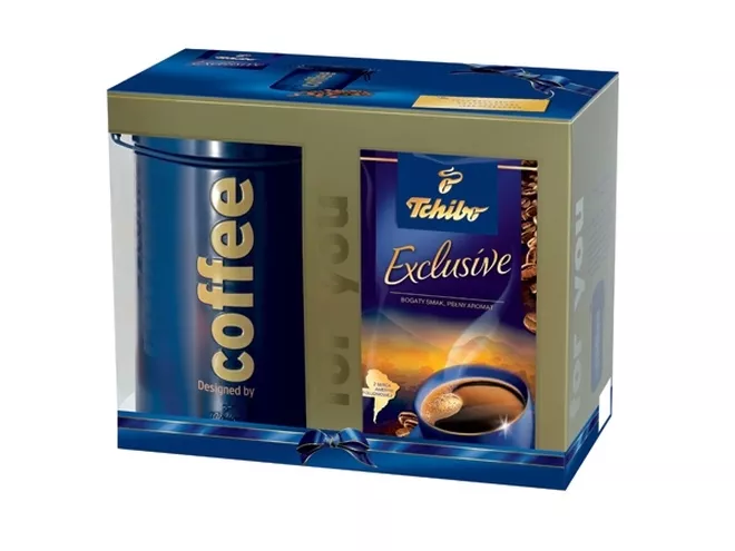 Zestaw zawierający kawę mieloną Tchibo Exclusive (500 g) i stylową puszkę do przechowywania kawy. Rekomendowana cena: 11,59 zł
