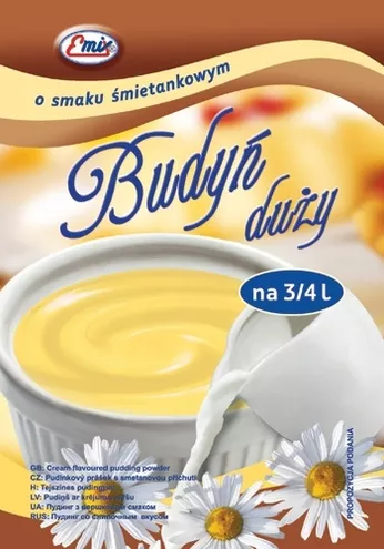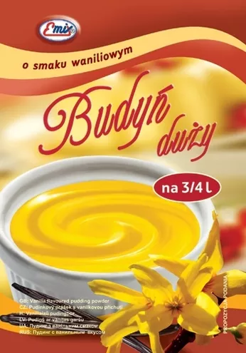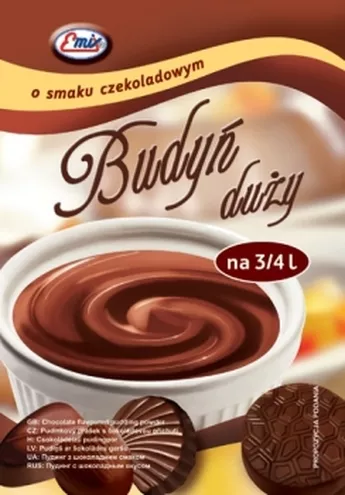 Z pewnością każdy pamięta smak i zapach ciepłego budyniu, podawanego najczęściej z domową konfiturą czy sokiem owocowym... Marka Emix producent deserów i ciast, wprowadziła na rynek nowe budynie w prawdziwie rodzinnej gramaturze (opakowanie 65 gram). Duży Budyń, który przygotujemy na ¾ litra mleka, starczy na deser dla całej rodziny lub przygotowanie rodzinnej blachy pysznego ciasta. Budyń dostępny w smakach: śmietankowym, czekoladowym i waniliowym. Atutami dużego budyniu EMIX® jest łatwość i szybkość jego przygotowania oraz to, że w trakcie nie tworzą się w nim grudki. W efekcie uzyskujemy pyszny i tradycyjnie przyrządzony budyń o wspaniałej, kremowej konsystencji.