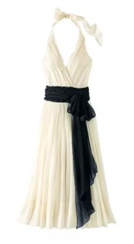 Kopertowy dekolt w kształcie litery V uwydatni kobiecy biust. Czarna szeroka szarfa zawiązywana z przodu na kokardkę, podkreśla talię. Bogate draperie zdobią dekolt. Lekkości dodaje wiązane ramiączko na szyi.