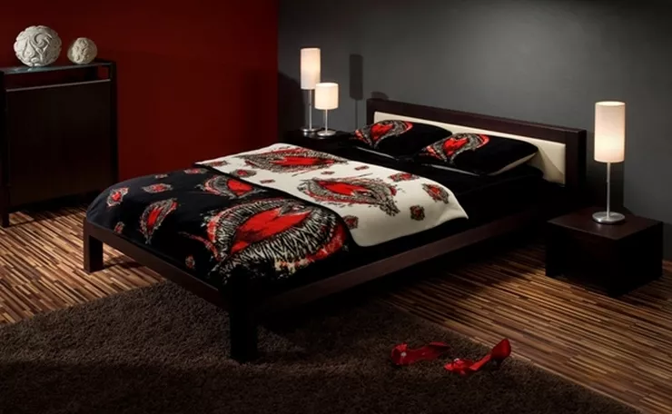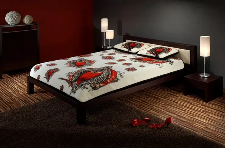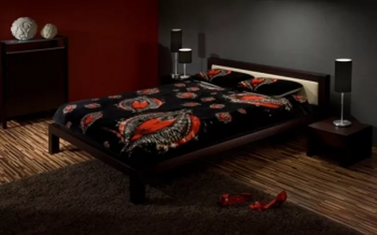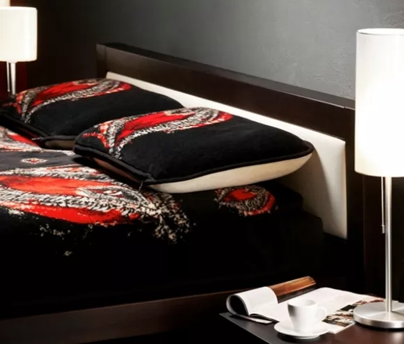 Komplet tej unikatowej pościeli charakteryzuje się pięknym motywem orchidei, tkanym na czarnej wełnie merynosa australijskiego. Harmonijne połączenie nasyconych kolorów – wyzywającej czerwieni i enigmatycznej, głębokiej czerni –prowokuje wyzywającym designem, wabi tajemnicą, zniewala