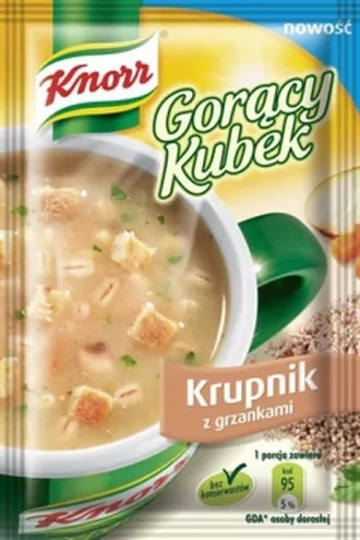 Nowy wariant Gorących Kubków KNORR – Krupnik z grzankami, różni się od dotychczasowych propozycji, bo dodatkowo zawiera płatki jęczmienne. Teraz przygotowanie tradycyjnej polskiej zupy jest kwestią pięciu minut. Wystarczy kubek, gorąca woda, krótka chwila i zupa gotowa!