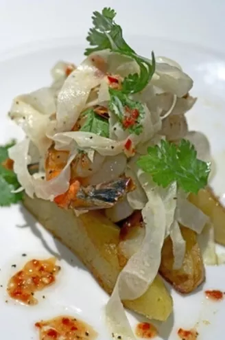 • stek z rekina podany z ryżem z cytrusami, sałatka z awokado i czerwonej cebuli, sos hoi sin z limionką i chili w cenie 65 PLN