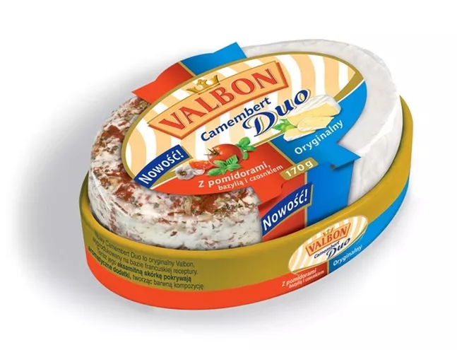 - Valbon Camembert Duo z Pomidorami, Bazylią i Czosnkiem oraz Oryginalny.