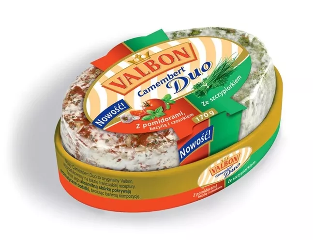 - Valbon Camembert Duo z Pomidorami, Bazylią i Czosnkiem oraz ze Szczypiorkiem;