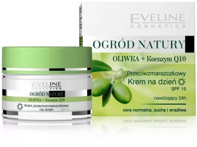 OGRÓD NATURY Przeciwzmarszczkowy krem na dzień Oliwka + Koenzym Q10 (do cery normalnej, suchej i wrażliwej) posiada właściwości nawilżająco – dotleniające. Przeznaczony jest do codziennej pielęgnacji skóry twarzy, a także wrażliwej skóry w okolicach oczu. Zawarta w nim wyjątkowa kompozycja składników aktywnych odbudowuje barierę hydrolipidową, wzmacnia skórę od wewnątrz czyniąc ją odporniejszą na działanie wolnych rodników, przyspiesza odnowę komórkową oraz efektywnie wspomaga procesy naprawcze. Dodatkowo dzięki zawartości filtra SPF15 krem zapewnia doskonałą ochronę przed szkodliwymi czynnikami środowiska zewnętrznego, w tym promieniowania UVA/UVB. Preparat doskonale się wchłania co sprawia, że idealnie nadaje się pod makijaż.