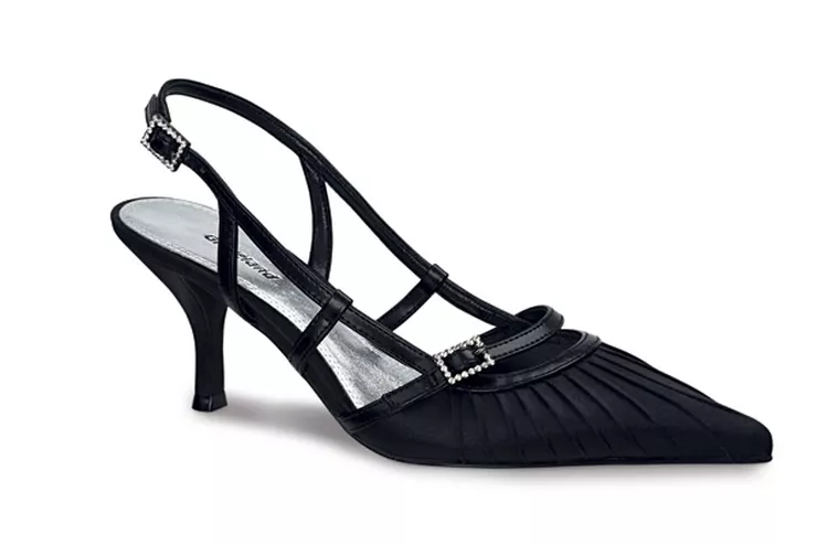 3. Satynowe czółenka z odkrytą piętą, zdobione sztrasem