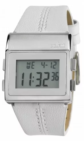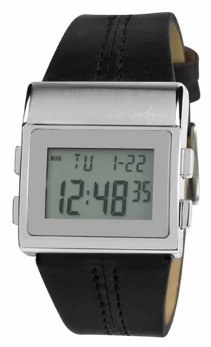 o ostrych liniach jak Frank, jest od niego mniejsza i delikatniejsza. Prostokątna cyfrowa tarcza, umieszczona w prostej kasetce ze stali nierdzewnej, idealnie współgra z masywnym paskiem, zarówno w wersji skórzanej jak i metalowej.