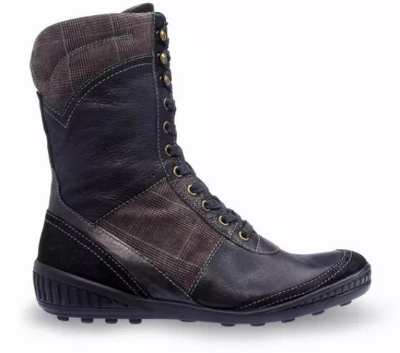 Szkocka krata to jeden z hitów sezonu jesień-zima 2008/2009. Niezwykle efektownie prezentuje się jako dodatek do innych materiałów i wzorów. W zimowej ofercie Geox znajdziemy casualowy model butów z wysoką cholewką, wyglądem przypominający trampki. Wykonane są z czarnej skóry z wstawkami z materiału w deseń szarej kraty, z cholewką sięgającą do połowy łydki. Wysokie sznurowanie pozwala dobrze trzymać stopę, a antypoślizgowa oddychająca podeszwa zapewnia nie tylko ochronę przed zimnem, ale także dobrą przyczepność i bezpieczeństwo, nawet podczas chodzenia po oblodzonych chodnikach.