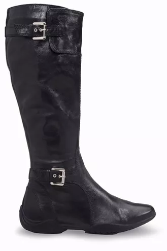 Pierwszą propozycją jest model z wysokimi zaokrąglonymi cholewkami, delikatnie zaokrąglonym noskiem, wykonany z cieniowanej, marszczonej skóry, dostępny w ciepłym odcieniu orzechowego brązu oraz w chłodnym ciemnobrązowym ze stalowym przebłyskiem. Przeplatane przeszycia wizualnie wyszczuplają nogę, a wiązanie z tyłu i klamerka na kostce dodają finezji i wdzięku. Zbliżony wyglądem jest model wykonany z miękkiej czarnej skóry, utrzymany w sportowym stylu. Urozmaiceniem nieco minimalistycznego wyglądu jest zastosowanie kwadratowych metalowych klamerek. Obydwa modele butów mają płaskie oddychające podeszwy, z zabezpieczeniem antypoślizgowym, zapewniające stabilność i bezpieczeństwo w poruszaniu się po śliskim podłożu.