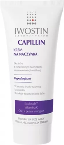 Krem na naczynka Iwostin Capillin przeznaczony do codziennej pielęgnacji wrażliwej, zaczerwienionej skóry z widocznymi popękanymi naczynkami krwionośnymi. Dzięki unikalnemu kompleksowi substancji aktywnych skutecznie zmniejsza zaczerwienienia oraz wzmacnia kruche naczynka krwionośne, zapobiegając ich pękaniu. Zawarta w kremie Esculoside czyli eskulina pozyskiwana z kory kasztanowca, działa przeciwzapalnie i przeciwrumieniowo. Wraz z witaminą C poprawia mikrokrążenie i dezaktywuje wolne rodniki. Olej z pestek winogron wzmacnia barierę lipidową naskórka i hamuje transepidermalną utratę wody (TEWL), a także nawilża i zmiękcza zaczerwienioną skórę. Preparat zawiera zielony pigment, który neutralizuje zaczerwienienia skóry. Nadaje się jako baza pod makijaż.